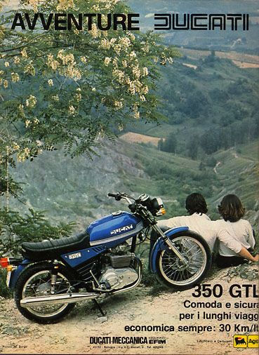 A trip to the countryside on a Ducati 350 GTL. Ducati parallel twins never sold very well and were unreliable.