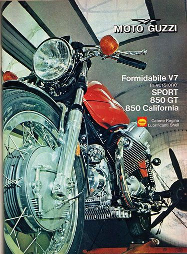Another fine Guzzi ad from 1973, featuring a V7 Sport in the famous Guzzi wind tunnel. The red tank must have been a one-off though